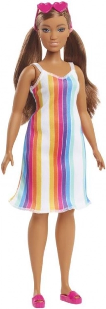 Bábika má štýlový letný outfit s farbami a vzormi inšpirovanými plážou.
