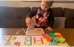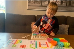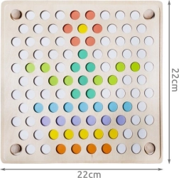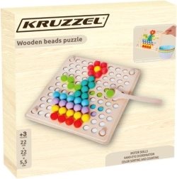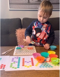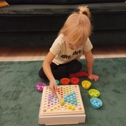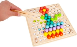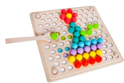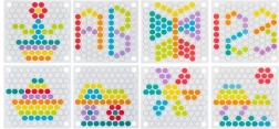 doska na vkladanie korálikov, košíky na koráliky, koráliky (7 farieb), lyžička, pinzeta, tyčinky, obrázkové predlohy