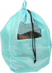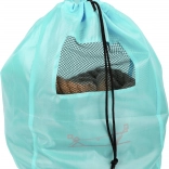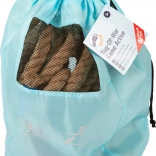 Tyrkysové vrecko so sieťovaným okienkom umožňuje jednoduché prenášanie a skladovanie lana po hre.