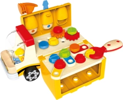 Robustný nákladiak kombinuje drevo a plast pre dlhú životnosť a ľahké ovládanie. Vyklápacia korba pridáva realistické prvky do hry.