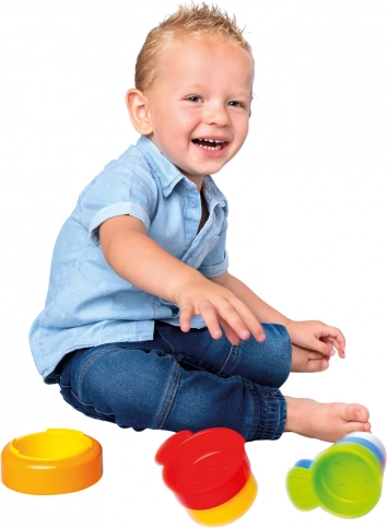 Skladanie krúžkov na základňu a vkladaníe do seba posilňuje pršteky, úchop a koordináciu oko–ruka už od 10 mesiacov.