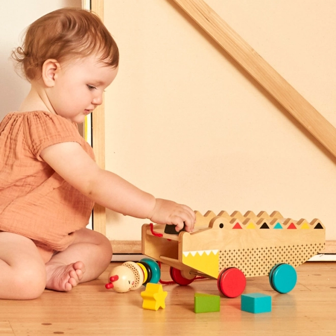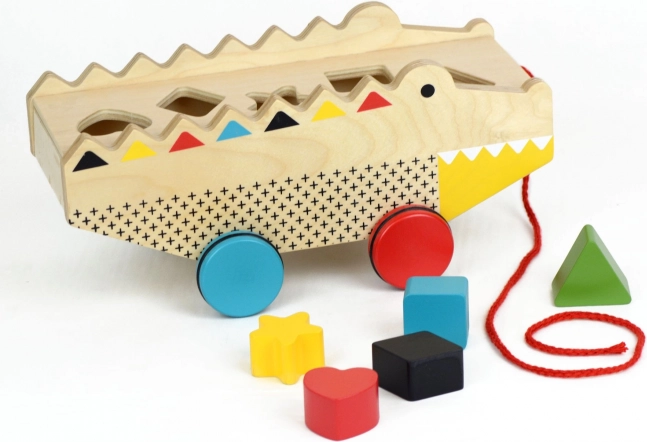 Tento drevený ťahací aligátor s vkladačkou je ideálnou hračkou pre malých objaviteľov od 18 mesiacov. Päť robustných tvarov deti ľahko vkladajú do zodpovedajúcich otvorov, čím rozvíjajú koordináciu ruka–oko a logické myslenie. Vďaka praktickej šnúrke na ťahanie a pogumovaným kolieskam si užijú veľa aktívnej zábavy doma aj na cestách.