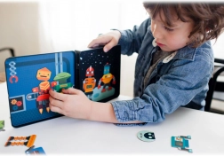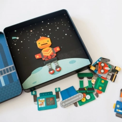 Magnetická sada s robotmi je skvelá zábava pre deti od 3 rokov. Vďaka viac než 25 magnetickým dielikom môžu malí konštruktéri skladať nekonečné kombinácie robotických postáv a rozvíjať tak fantáziu aj tvorivosť. Plechová krabička sa pevne uzatvára a vo vnútri ukrýva dve farebné scény, na ktoré možno dieliky ľahko prichytiť.