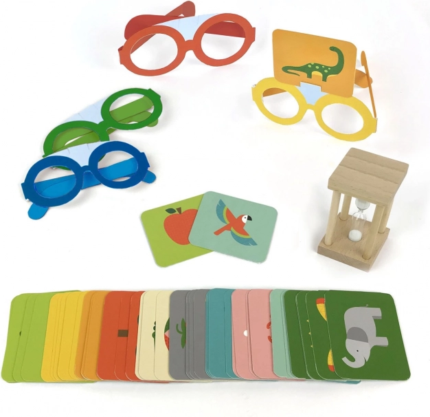 - 4 okuliare s držiakom na kartu, presýpacie hodiny, 50 kariet s ilustráciami
