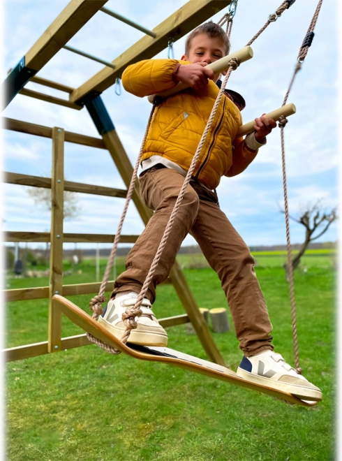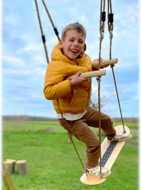 Táto netradičná hojdačka kombinuje zábavu a rozvoj motoriky. Prkno z pevnej preglejky so zahnutými hranami a nastaviteľné madlá z masívneho dreva umožnia deťom bezpečne trénovať rovnováhu, koordináciu a stabilitu. Vďaka protišmykovej ploche je hojdanie v stoji istejšie a pohodlnejšie.