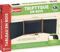 Multifunkčná trojkrídlová tabuľa JEUJURA je skvelou voľbou do detskej izby, herne aj škôlky. Ponúka čiernu písaciu plochu na kriedy a bielu tabuľu pre suché popisovače, ktoré možno ľahko zotrieť plstenou hubkou. Centrálne pole čiernej tabule je linajkované a obsahuje predlohy písacieho písma, takže deti môžu trénovať správny tvar písmen.