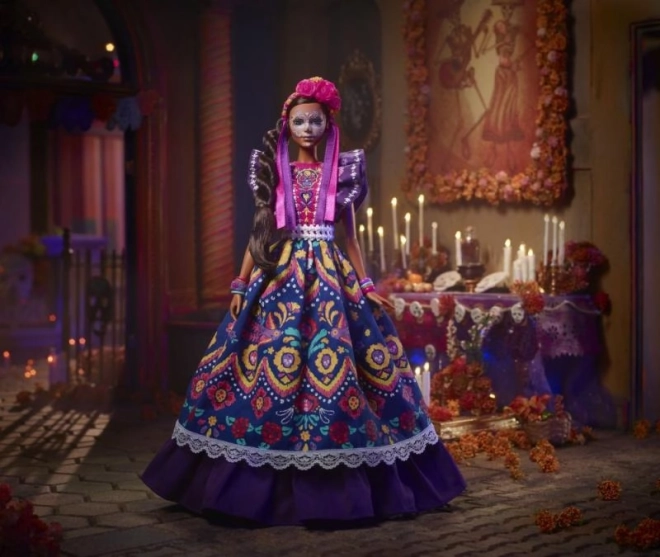 Bábika s komplexnými detailmi na maľbe tváre a dizajnu šiat reflektuje tradície a kúzlo Dia De Muertos.