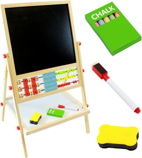 Táto drevená obojstranná tabuľa je ideálna pre malé deti na učenie sa a zábavu. Ponúka rôzne možnosti využitia, vrátane kreslenia kriedou a fixkami.