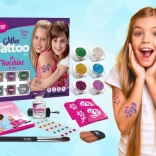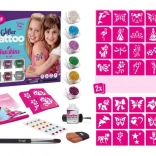 Veľká sada najobľúbenejších dievčenských vzorov. Vzory: 57 ks. Farby: 6 ks. Vzor zvyčajne vydrží na koži 8 – 18 dní. Dĺžka tejto doby vo veľkej miere závisí od typu pokožky a miery opatrnosti, s akou k tetovaniu pristupujete. Trblietavé tetovanie je odolné voči vode, dá sa však ľahko odstrániť alkoholom alebo detským olejčekom. Väčšie sady obsahujú viac nástrojov: Pohyblivé oči/samolepiace kamienky: Hotový vzor môžete prizdobiť. Naneste malé množstvo lepidla na samolepiace kamienky a pritlačte ich na kožu. Prajeme vám veľa zábavy!