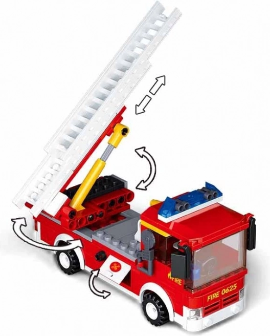 - Autentické hasičské vozidlo: červený dizajn, otočný a výsuvný rebrík, doplnky na zásah.