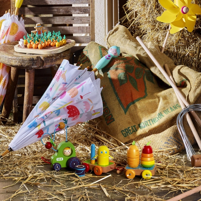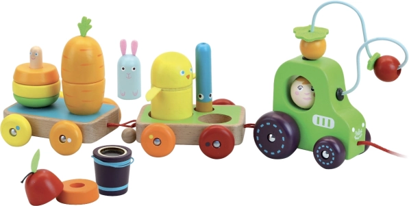 - Posuvné korálky: Traktor má korálky na drôte v tvare ovocia, ktoré podporujú motorické zručnosti.