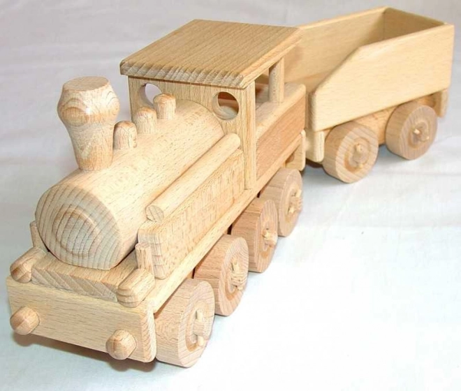 Tento drevený model parnej lokomotívy zaujme precíznym spracovaním bukového dreva a prirodzeným dizajnom zvýrazneným iba voskovaním a leštením. Lokomotíva má pohyblivé kolieska a je navrhnutá bez ostrých hrán, čo zabezpečuje bezpečné hranie pre deti. Vďaka tomu je vhodná nielen na hranie doma, ale aj na pieskovisku.