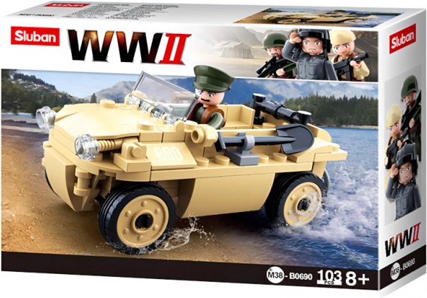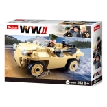 Stavebnica ponúka detailnú repliku nemeckého obojživelného vozidla, obohatenú o realistické prvky ako čelné sklo a pohyblivé kolesá.