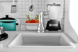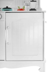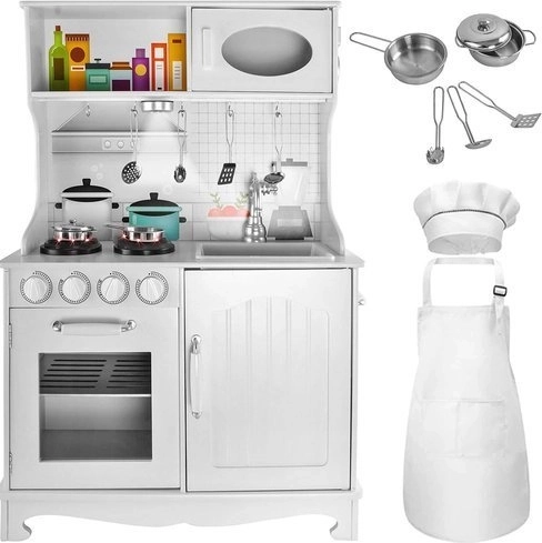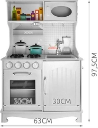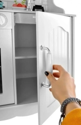 Kuchyňa má dva horáky so senzorickými gombíkmi, na ktoré môžete umiestniť priložený hrniec a panvicu. Drevená kuchynka umožňuje vysvetliť dieťaťu nebezpečenstvo horákov bez rizika popálenia. Kuchynka je vybavená aj (odnímateľným) drezom s kohútikom. Prítomnosť drezu pomáha vysvetliť, že okrem priestoru na prípravu jedla je v kuchyni rovnako dôležitý aj priestor na následné upratovanie. Môže to byť úvod do vysvetľovania domácich prác vašim deťom. Ako v každej modernej kuchyni, ani tu nesmie chýbať mikrovlnná rúra a rúra na pečenie. Malé dievčatká a chlapci budú nadšení, keď budú môcť "variť" vo vlastnej detskej kuchynke