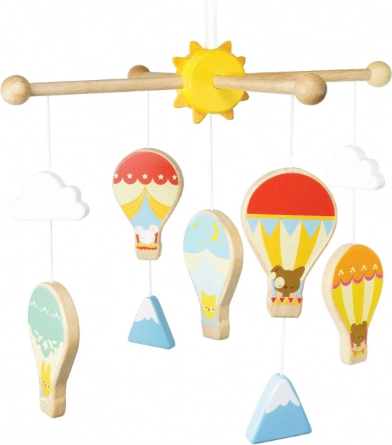Očarujúci závesný kolotoč s motívom teplovzdušných balónov rozžiari každý detský kútik. Jemne sa pohojdáva nad postieľkou či kočíkom a vytvára pokojnú atmosféru na zaspávanie. Vyrobený z udržateľného kaučukovníkového dreva a dekorovaný netoxickými farbami na vodnej báze, s ručne maľovanými detailmi a farebným dizajnom. Ľahké zavesenie vďaka textilným šnúrkam a kvalitné spracovanie zaručujú dlhú životnosť.
