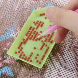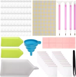 Pre komfortnú prácu nechýbajú 4 aplikátory rôznych veľkostí, presná pinzeta, 3 triediace misky a silikónový skladací lievik na jednoduché presýpanie kamienkov bez neporiadku. Voskové štvorčeky zaistia istý odber kamienkov a vyrovnávacia špachtľa pomôže s dokonale rovným výsledkom.