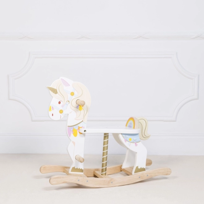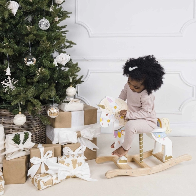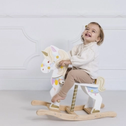Hojdací jednorožec LE TOY VAN z kolekcie Petilou je klasická hračka v modernom poňatí. Vďaka pevnému drevenému základu a premyslenej ergonómii podporuje prirodzené hojdanie, rozvíja koordináciu, rovnováhu a istotu v pohybe. Bohaté farebné detaily, zlatý roh a milý výraz podnecujú fantáziu aj radosť z hry.
