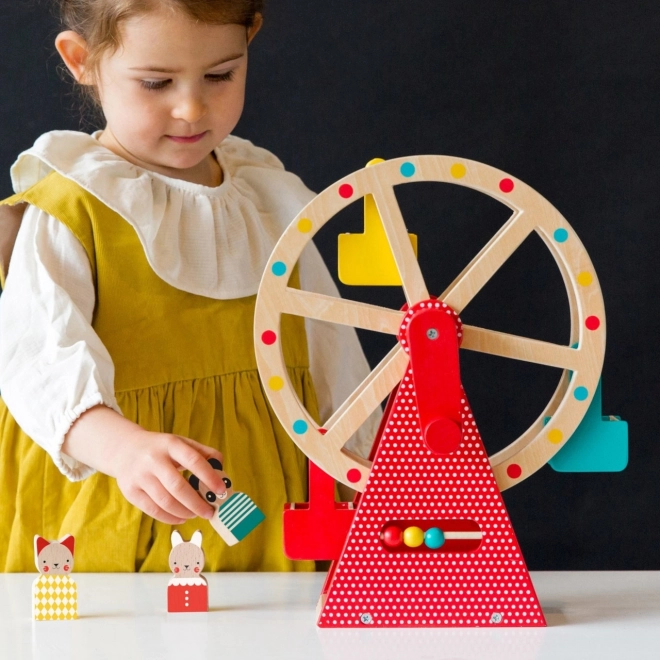 Drevené ruské koleso PETIT COLLAGE je pripravené na okamžitú hru – je predom zmontované a ľahko sa ovláda pomocou plynulej ručnej kľuky. Tri farebné kabínky vozia troch zvieracích hrdinov z bukového dreva a podporujú fantáziu, počítanie aj vnímanie farieb a čísel.