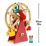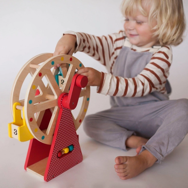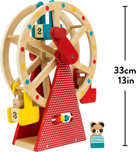 Deti môžu jednoducho roztočiť veľké koleso pomocou robustnej kľuky a pozorovať, ako sa kabínky plynulo pohybujú – skvelý tréning koordinácie a trpezlivosti.