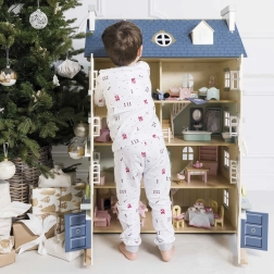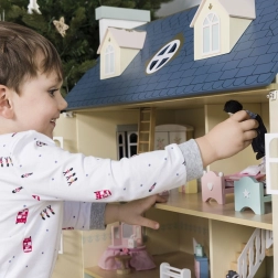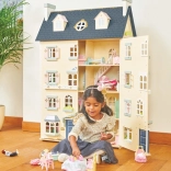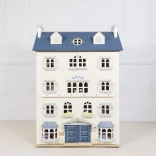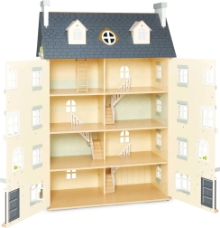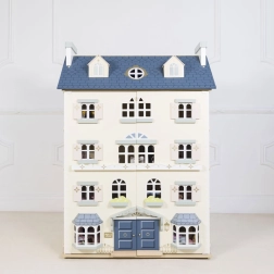 Palácový domček pre bábiky LE TOY VAN je výnimočná hračka a dizajnový kúsok v jednom. Na každej strane nájdete množstvo okien, niektoré možno otvoriť rovnako ako nádherné vstupné dvere v kráľovskej modrej. Osem štýlových miestností zdobia elegantné nástenné dekorácie a veľké centrálne schodisko siahajúce až do štvrtého poschodia. Oddeliteľná strecha odhaľuje priestranné podkrovie prístupné rebríkom – ideálne na herné scenáre aj ako úložný kút.