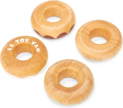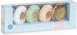 Táto sada drevených donutov od Le Toy Van je nielen esteticky príjemná, ale predovšetkým bezpečná a vyrobená z masívneho dreva. Každý z donutov je jemne zaoblený pre bezpečné hranie a zdobený pastelovými odtieňmi s rôznymi vzormi posypu. Vodou riediteľné farby použité pri ručnom domalovávaní sú netoxické a úplne bezpečné pre deti.