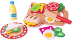 V sade nájdete všetko pre prípravu chutného sendviča: bagetku, plátky chleba, majonézu, šalát, uhorku, syr, vajce a paradajku, doplnené o tanier, doštičku a nôž. Materiály pochádzajú z zodpovedných zdrojov a hračka spĺňa európske bezpečnostné normy, takže sa na ňu môžete spoľahnúť.