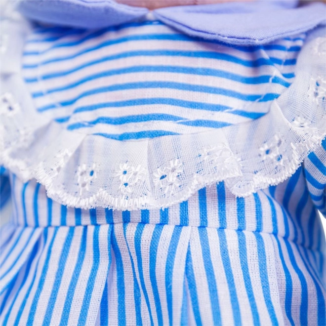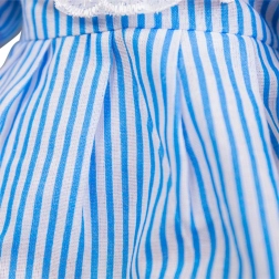 Šaty v modro‑bielom prúžku s ozdobnou čipkou možno ľahko vyzliekať a znova obliekať – podporujú samostatnosť a jemnú motoriku.