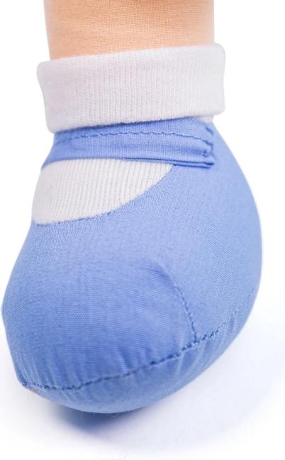 Amelia je hebká látková bábika s hnedými vrkôčikmi z priadze, modro‑bielymi pruhovanými šatočkami a priateľským úsmevom. Je navrhnutá na bezpečné mojkanie od prvých dní, podporuje rozvoj jemnej motoriky a empatie a skvele sa hodí na prvé hry na starostlivosť.