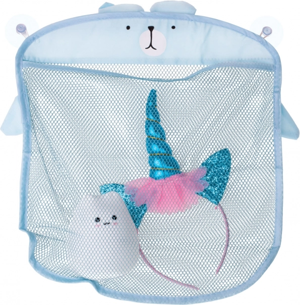 Modrý kúpeľňový organizér na detské hračky so zvieratkom. Rýchle schnutie, pevné prísavky, jednoduchá údržba a univerzálne využitie. Poriadok v kúpeľni ľahko.
