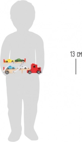 Pozor, nakladá sa! Tento robustný drevený kamión s autami od značky small foot prepraví až štyri športové autíčka naraz. Má pohyblivú hornú plošinu na ľahké nakladanie a vykladanie, bezpečnostnú závoru proti cúvnutiu a odolné prevedenie z kvalitného dreva a kovu – ideálne pre malých fanúšikov áut a každú detskú autodráhu.
