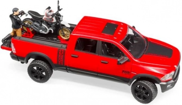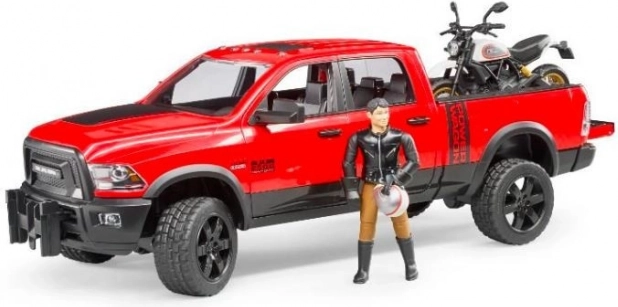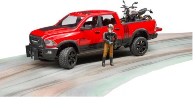pick‑up Ram, motocykel Ducati Scrambler, figúrka vodiča