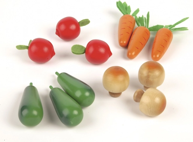 Sada obsahuje výber obľúbenej zeleniny – mrkvu, cuketu, paradajku a huby – uložené v odolnej drevenej prepravke. Všetko je starostlivo vyrobené z kvalitných a zodpovedne získaných materiálov, bezpečných pre detskú hru.