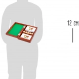 Pevná drevená schránka s kovovou západkou chráni karty aj kocky. Ľahko sa zmestí do batohu či kufra.