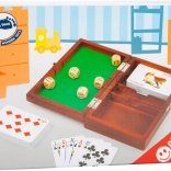 Dve kompletné balíčky kariet a kocky v prehľadných priehradkách, plus zelená podložka na pohodlné hádzanie – okamžite pripravené na hru.