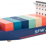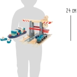Táto premyslená prístavná stavebnica prináša deťom realistickú hru na logistiku: loď s dvoma remorkérmi je pripravená na vyplávanie, zatiaľ čo žeriav prekladá farebné kontajnery vďaka integrovaným magnetom. Robustné drevené diely a plynulé funkčné prvky podporujú jemnú motoriku, predstavivosť a trpezlivosť.