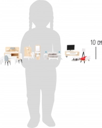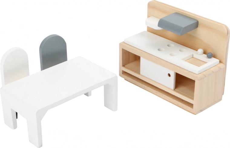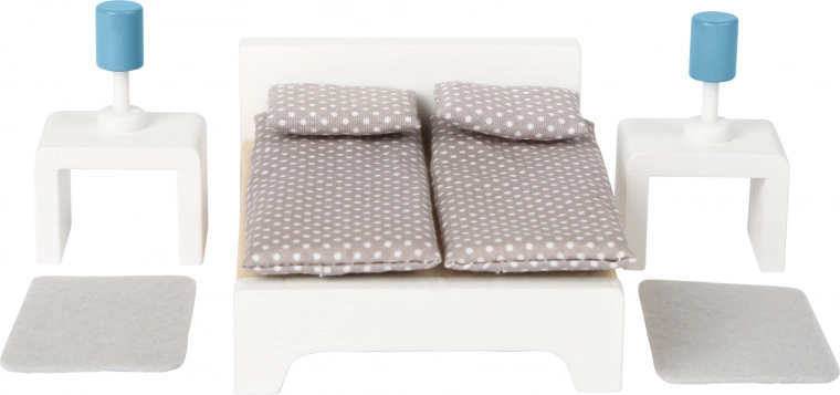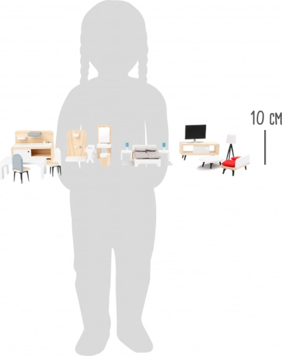 Štýlová a nadčasová sada nábytku SMALL FOOT premení každý domček pre bábiky na útulný domov. Kombinácia prírodného dreva a bielej farby pôsobí čisto a moderne, detaily ako vankúšiky, lampičky či zrkadlo dodajú hre realistickosť. Diely sú prispôsobené malým detským rukám a vyznačujú sa pevnosťou a odolnosťou.
