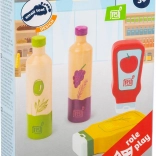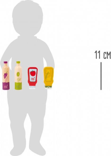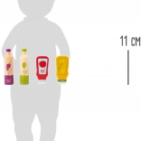 Každá fľaštička má výrazné ilustrácie (olej, ocot, kečup, horčica), vďaka ktorým deti ľahko spoznajú obsah a zapoja ich do hry na varenie.