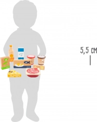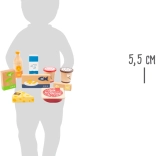 Set obsahuje pomarančový džús, dve balenia zmrzliny, balenie hrášku, rybie prsty, maslo, syr, krájaný salám a krabicu mlieka. Realistické potlače a prírodný vzhľad zaujmú na prvý pohľad. Vďaka pevnému drevu je sada odolná a pripravená na každodenné hranie.