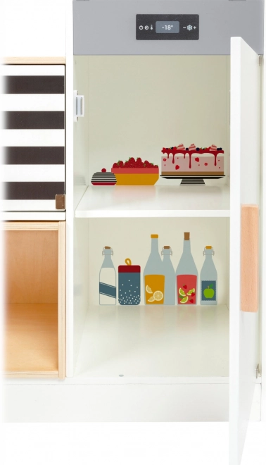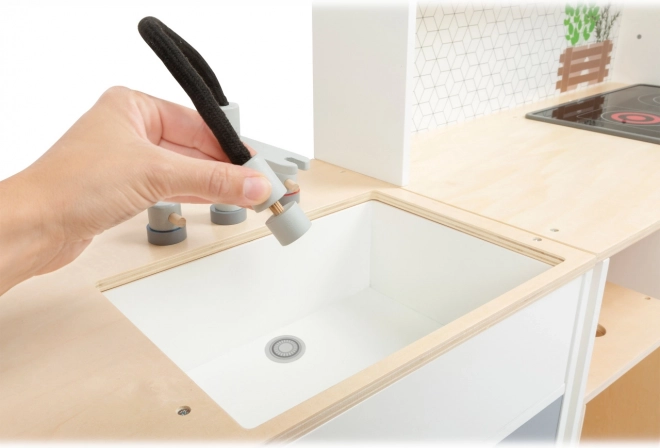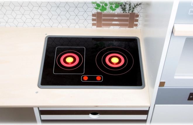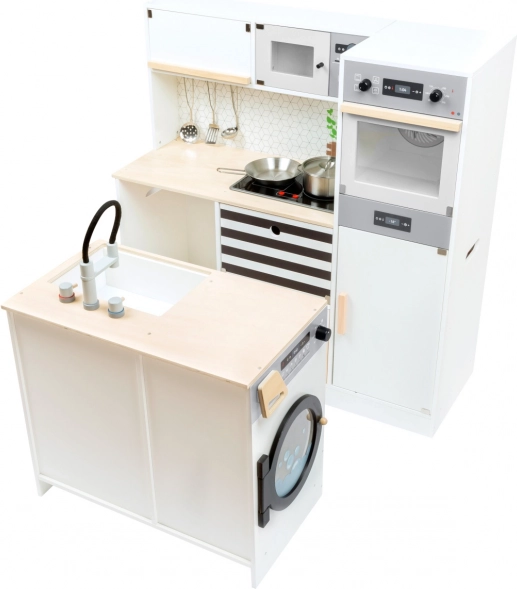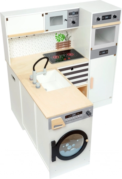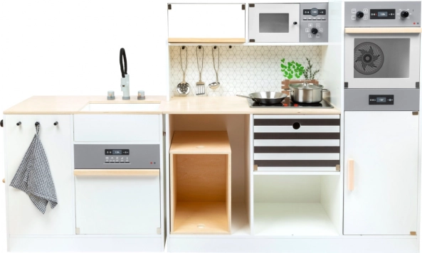 Táto modulárna drevená kuchynka XL SMALL FOOT je navrhnutá pre kreatívnu a realistickú hru. Možno ju zostaviť ako rohovú kuchyňu (tvar L) alebo ako kuchynskú linku s funkčným ostrovčekom, takže sa ľahko prispôsobí priestoru aj štýlu hry. Otočné gombíky s cvakaním a varná doska s LED svetlom a zvukom (2x AA batérie, nie sú súčasťou balenia) prinášajú autentický zážitok z varenia.