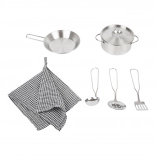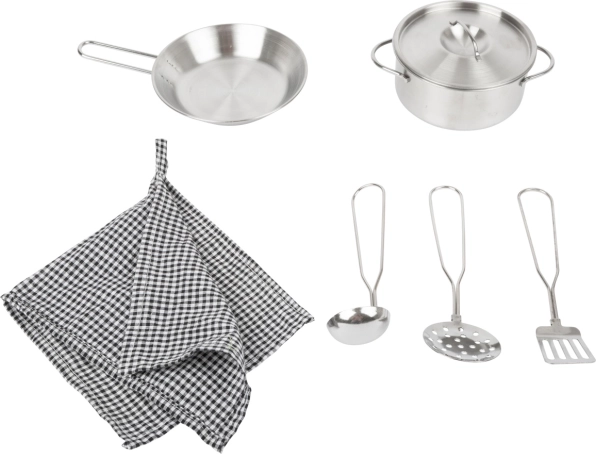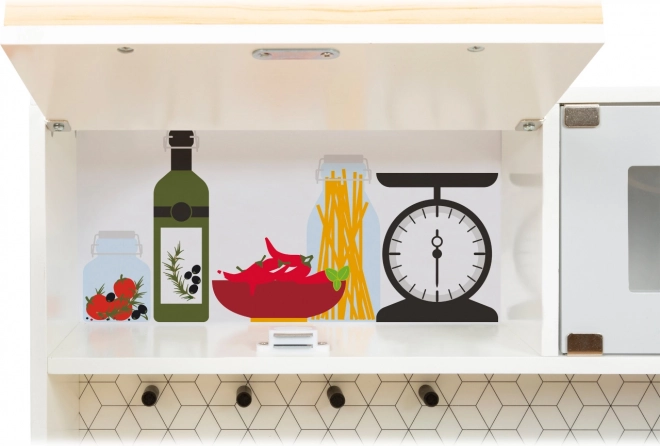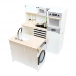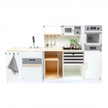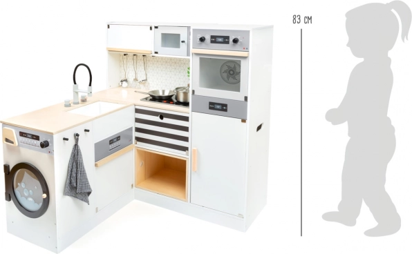 Kuchynka zahŕňa sporák, rúru, mikrovlnnú rúru, chladničku aj bohaté úložné skrinky s dvierkami. Ostrovček je vybavený drezom, práčkou a umývačkou. Súčasťou balenia je tiež kvalitné kovové riady na okamžitú hru. Vďaka robustným materiálom (drevo, plast, kov) je kuchynka stabilná a odolná – ideálna na každodenné hranie detí od 3 rokov.