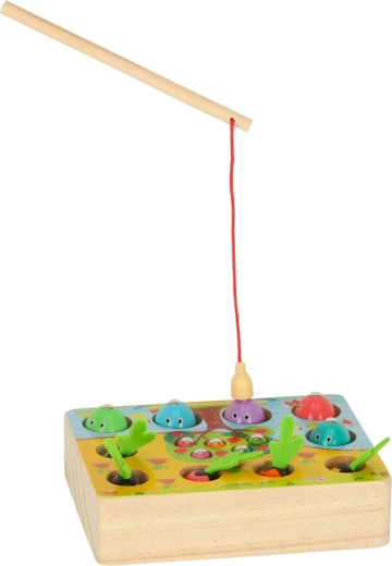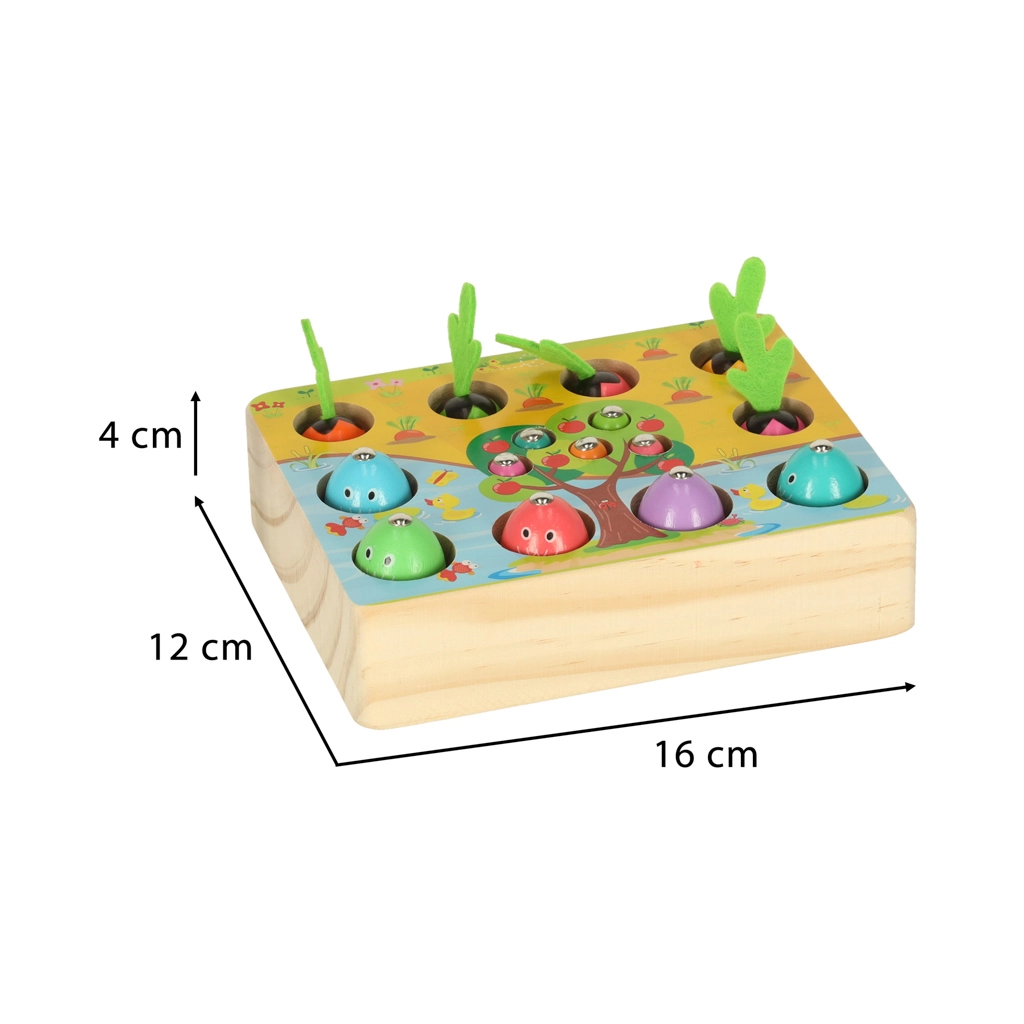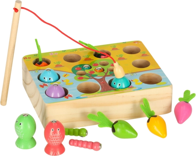 Táto multifunkčná drevená sada prenesie deti k rybníku aj do záhradky – a to priamo doma. S magnetickým prútom budú malí rybári loviť rybičky a červíky z pripravených otvorov, zatiaľ čo malých záhradníkov čaká zber farebných mrkvičiek za mäkké plstené lístky. Hra prirodzene rozvíja sústredenie, presnosť pohybov a učí deti rozlišovať farby.