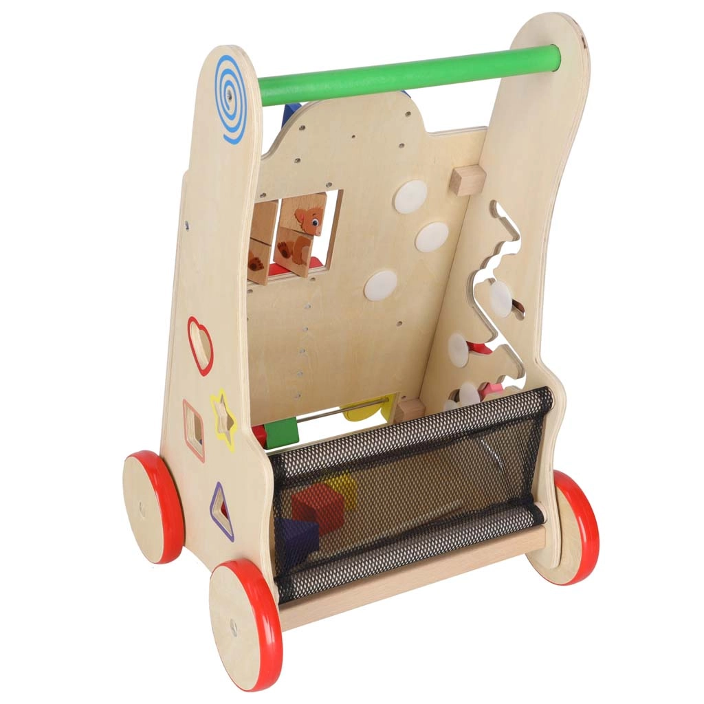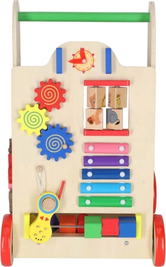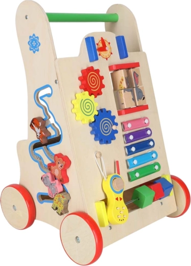Objavte multifunkčné drevené chodítko 6v1, ktoré spája oporu pri chôdzi a vzdelávacie centrum v jednom. Predný panel ponúka pestré aktivity: pohyblivé ručičky hodín, otáčacie ozubené kolieska, malý xylofón s paličkou, posuvné prvky a otočné obrázky. Bočné strany dopĺňa triedenie tvarov a zábavný labyrint so zvieratkami. Vďaka stabilnej konštrukcii a kolieskam s protišmykovou gumou je chôdza istejšia a bezpečnejšia.