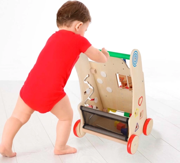 Drevené chodítko 6v1 pomáha deťom bezpečne trénovať prvé krôčiky a zároveň ponúka bohaté aktivity pre jemnú motoriku, zmyslové vnímanie a učenie. Stabilná konštrukcia s gumovými kolieskami zaisťuje istotu pri chôdzi, zatiaľ čo xylofón, ozubené kolieska, hodiny a triedenie tvarov zabavia na dlhé hodiny. Praktická úložná debnička so sieťkou pojme paličku aj ďalšie hračky.