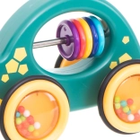 Koráliky vo vnútri koliesok vydávajú príjemný chrastivý zvuk pri každom pohybe hračky, stimulujú sluch a povzbudzujú deti k pohybu.
