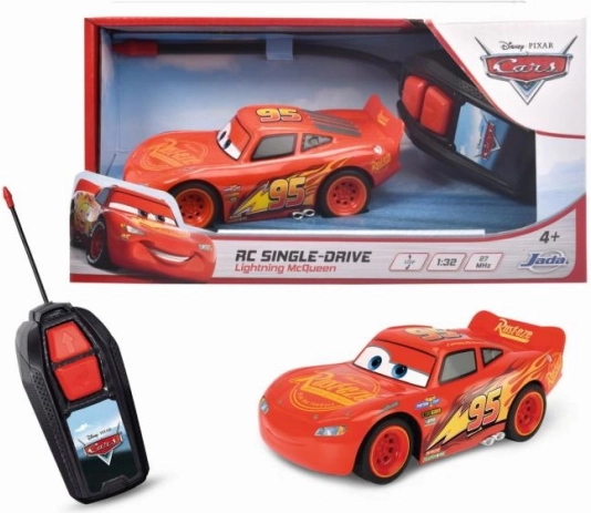 Diaľkovo ovládané auto Blesk McQueen s licenciou Cars 3. 1 kanál (jazdí dopredu, dozadu a zatáča), frekvencia 27 MHz. Mierka 1:32, dĺžka 14 cm.