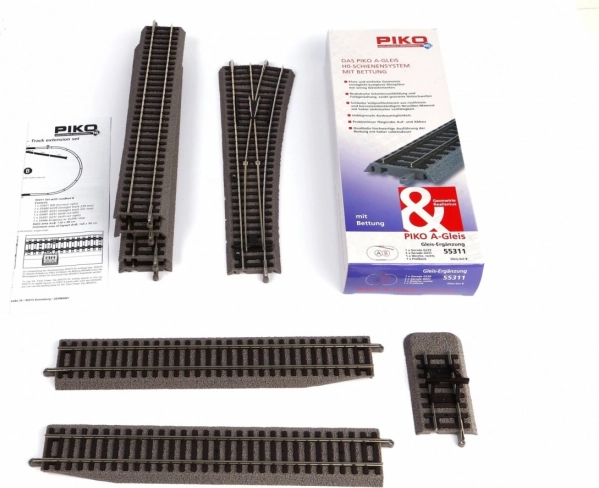 Kompletný železničný set PIKO pre mierku H0 s realistickým podložím a vernou textúrou podvalov. Obsahuje dva rovné úseky a jednoduchú výhybku na kusú koľaj, ktorú možno ručne ovládať. Ideálne na rozšírenie oválu – stačí doplniť oblúkové koľaje a rovnú koľaj s napájacím pripojením. Kvalitné podložie zabezpečuje stabilitu a tichú prevádzku.