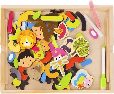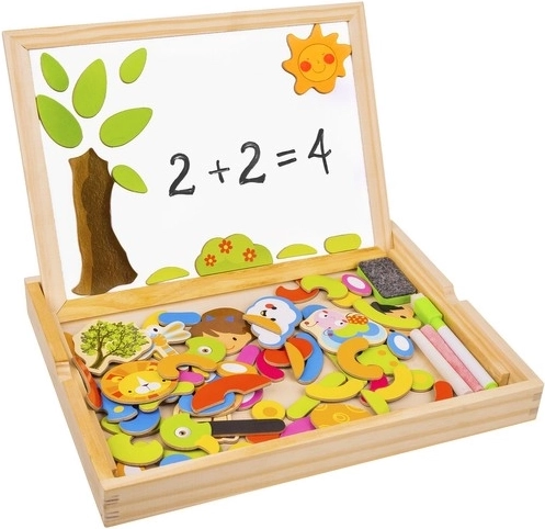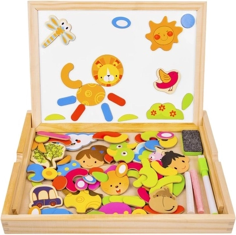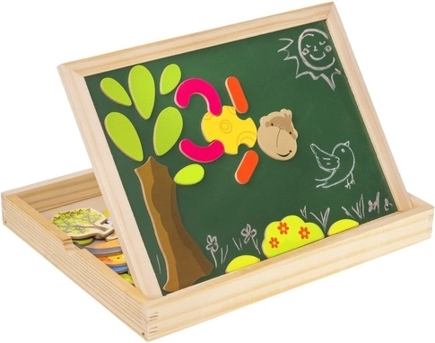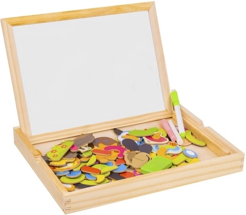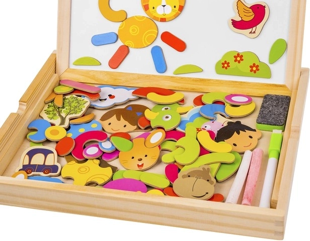 Prineste svojim deťom hodiny zábavy a kreatívneho učenia s touto drevenou magnetickou doskou! Doska ponúka dve strany: čiernu pre kreslenie kriedou a bielu pre písanie fixkou alebo aranžovanie magnetických obrázkov. Vďaka brožúre s príkladmi môžu deti vytvárať rôzne vzory a motívy.