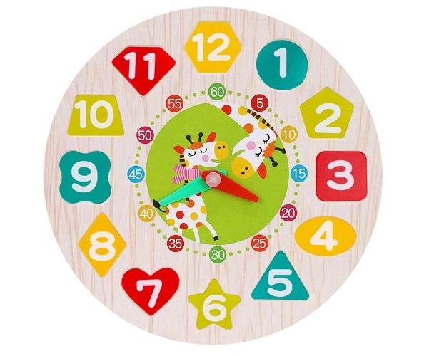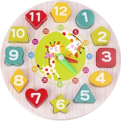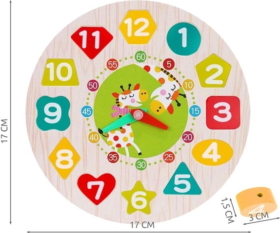Táto drevená edukačná hračka spája hru a učenie v jednom. Okrúhly podstavec s číslami 1–12 v rôznych tvaroch učí deti priraďovať tvary, rozpoznávať farby a číslice, zatiaľ čo pohyblivé hodinové a minútové ručičky pomáhajú pochopiť celé hodiny aj minúty. Odolné drevené diely sú príjemné do ruky a bezpečne opracované.