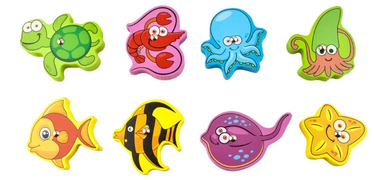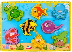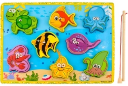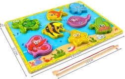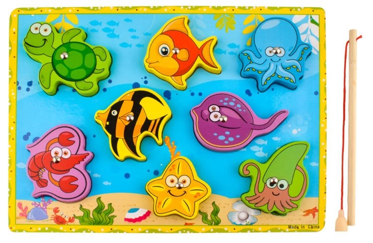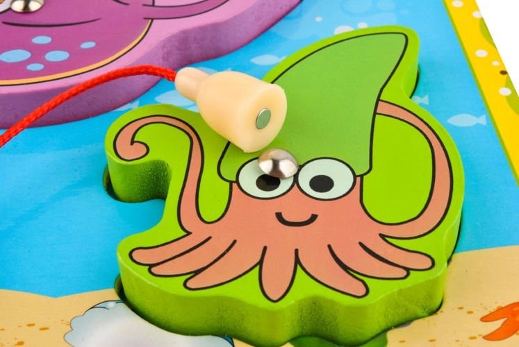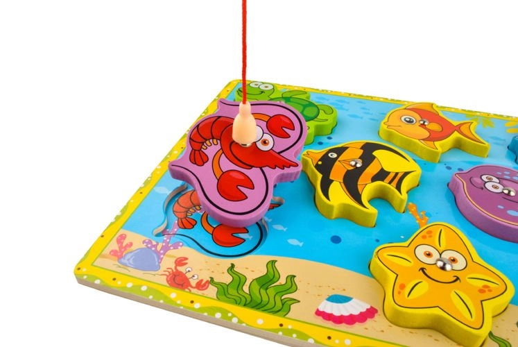 Táto farebná drevená skladačka s magnetickým prútom premení učenie na hru. Deti vkladajú 8 morských zvieratiek do správnych výrezov a pomocou magnetu ich aj „vylovia“ z dosky. Silné magnety uľahčujú manipuláciu aj menším deťom a podporujú istotu úchopu.
