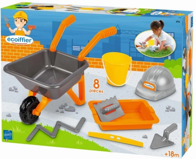 Zábavná a odolná múrarská sada do pieskoviska s 8 kusmi náradia pre malých staviteľov. Obsahuje táčko, vedierko, vodováhu, skladací meter, múrarskú lyžicu, hladidlo, misku a pracovnú prilbu – všetko pre kreatívne stavanie z piesku aj hry na stavenisku.